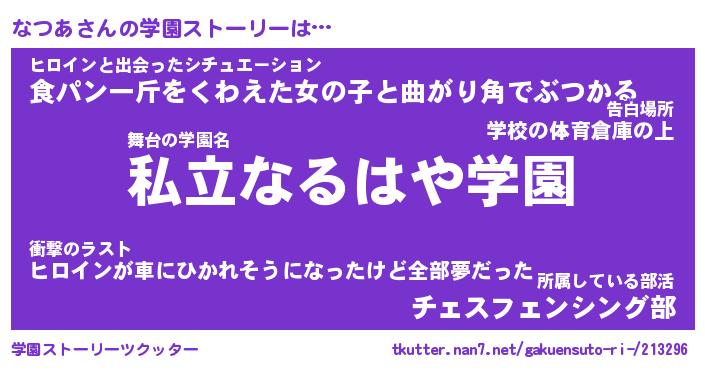 | 女子向けラノベタイトル風あだ名 | 『なつあ姫と円卓の騎士』『なつあ恋絵巻』 |