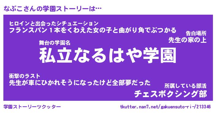 | 女子向けラノベタイトル風あだ名 | 『なぶこ姫と円卓の騎士』 |