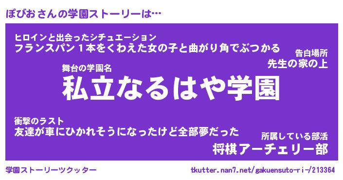 | 女子向けラノベタイトル風あだ名 | 『(仮)ぽびおのやんごとなき事情』 |
