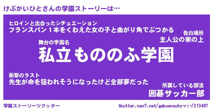 | 女子向けラノベタイトル風あだ名 | 『(仮)けぶかいひとのやんごとなき事情』 |