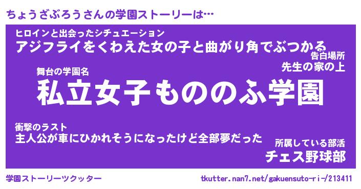 | 女子向けラノベタイトル風あだ名 | 『ちょうざぶろう姫と円卓の騎士』 |