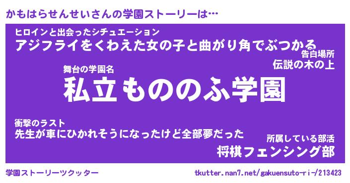 | 男性向けラノベタイトル風あだ名 | 『かもはらせんせいの憂鬱』 |