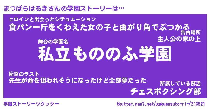 | 女子向けラノベタイトル風あだ名 | 『(仮)まつばらはるきのやんごとなき事情』 |
