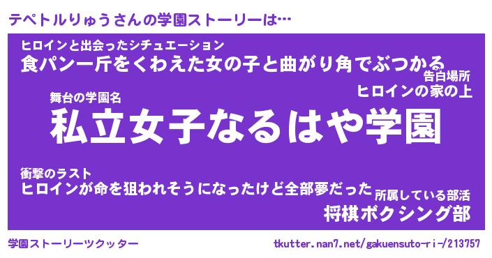 | 女子向けラノベタイトル風あだ名 | 『テペトルりゅう姫と円卓の騎士』 |