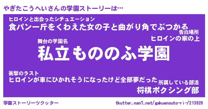 | 女子向けラノベタイトル風あだ名 | 『(仮)やぎたこうへいのやんごとなき事情』 |