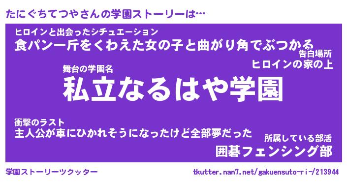 | 女子向けラノベタイトル風あだ名 | 『(仮)たにぐちてつやのやんごとなき事情』 |