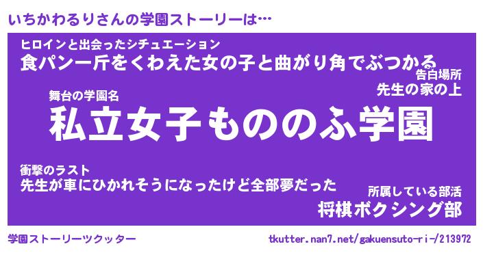 | 女子向けラノベタイトル風あだ名 | 『誰かこのいちかわるりを説明してください! ~契約から始まるウェディング~』 |
