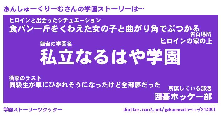 | 男性向けラノベタイトル風あだ名 | 『あんしゅーくりーむの憂鬱』 |