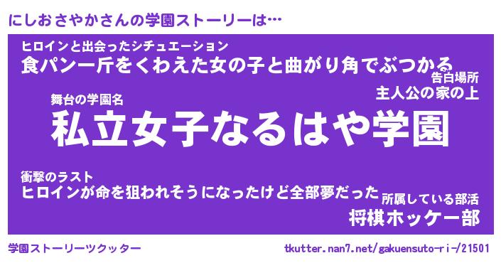 | 女子向けラノベタイトル風あだ名 | 『にしおさやか姫と円卓の騎士』 |