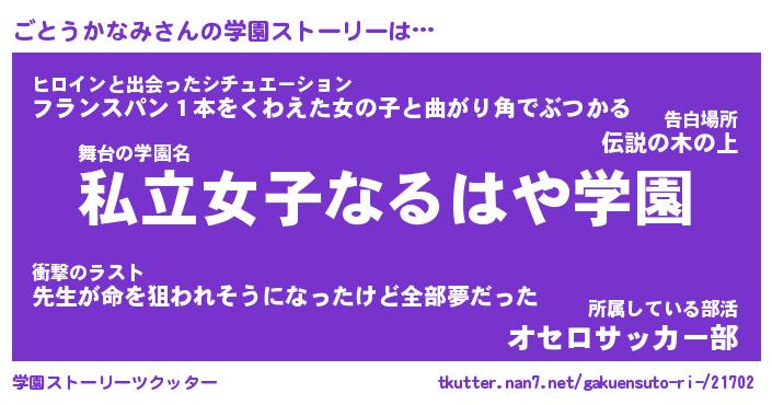 | 男性向けラノベタイトル風あだ名 | 『ゴトウカナミアートオンライン』 |