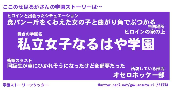 | 男性向けラノベタイトル風あだ名 | 『ココノセハルカアートオンライン』 |