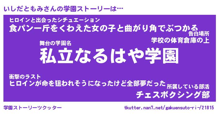 | ヒーロー風カッコイイあだ名 | 『スーパーイシダトモミ』『天弓騎士イシ』 |