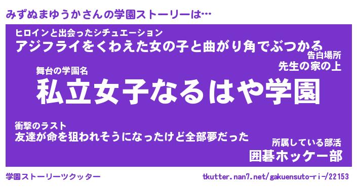 | 伝説のあだ名 | 『不死鳥のスナイパーみずぬまゆうか』 |