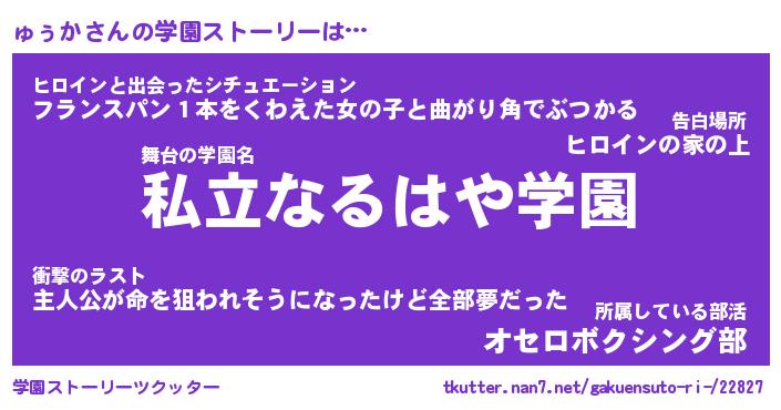 | 女子向けラノベタイトル風あだ名 | 『(仮)ゅぅかのやんごとなき事情』 |