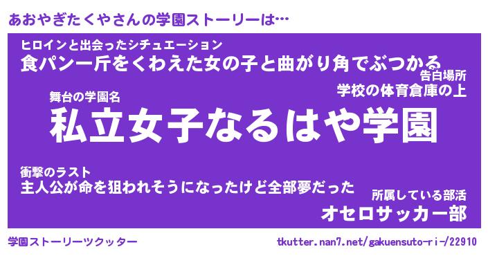 | 男性向けラノベタイトル風あだ名 | 『アオヤギタクヤアートオンライン』 |