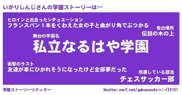 | 男性向けラノベタイトル風あだ名 | 『いかりしんじの憂鬱』 |