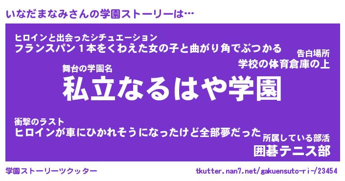 | ヒーロー風カッコイイあだ名 | 『スーパーイナダマナミ』『炎刃騎士イナ』 |