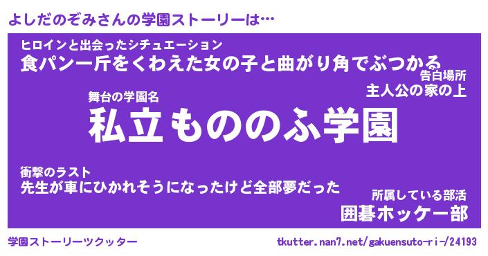 | 女子向けラノベタイトル風あだ名 | 『(仮)よしだのぞみのやんごとなき事情』 |