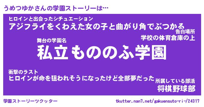 | 女子向けラノベタイトル風あだ名 | 『(仮)うめつゆかのやんごとなき事情』 |