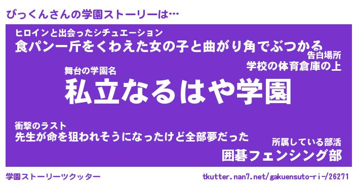 | 告白場所 先生の家の上 …「ふぃぎゅこ」 | 2月17日 06:24 |