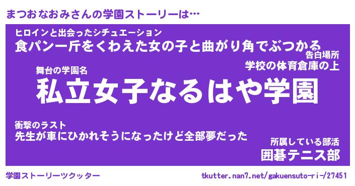| 伝説のあだ名 | 『封印されしスナイパーまつおなおみ』 |