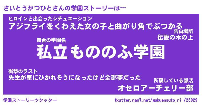 | 男性向けラノベタイトル風あだ名 | 『さいとうかつひとの憂鬱』 |