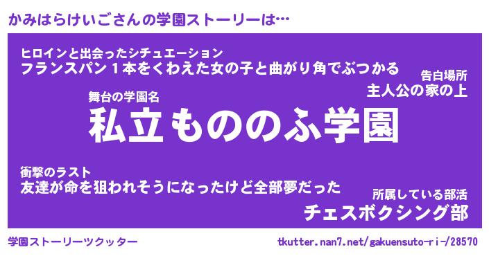 | 女子向けラノベタイトル風あだ名 | 『かみはらけいご姫と円卓の騎士』 |