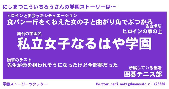 | 女子向けラノベタイトル風あだ名 | 『にしまつこういちろう姫と円卓の騎士』 |