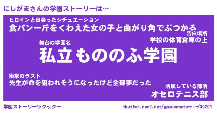 | 男性向けラノベタイトル風あだ名 | 『にしがまの憂鬱』 |