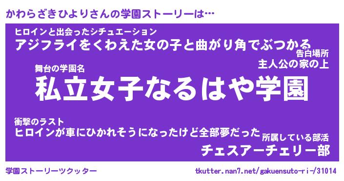 | 男性向けラノベタイトル風あだ名 | 『カワラザキヒヨリアートオンライン』 |