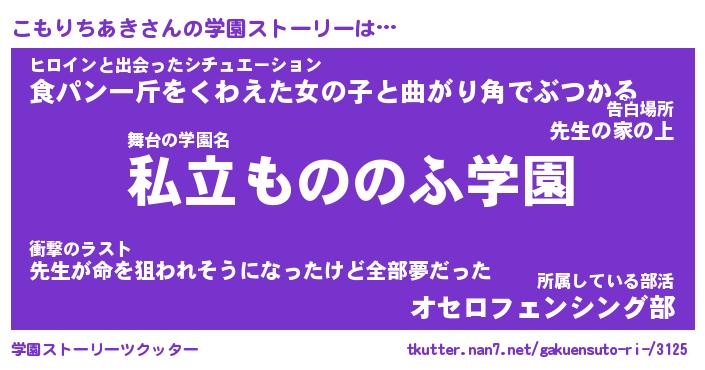 | ヒーロー風カッコイイあだ名 | 『スーパーコモリチアキ』『天弓騎士コモ』 |