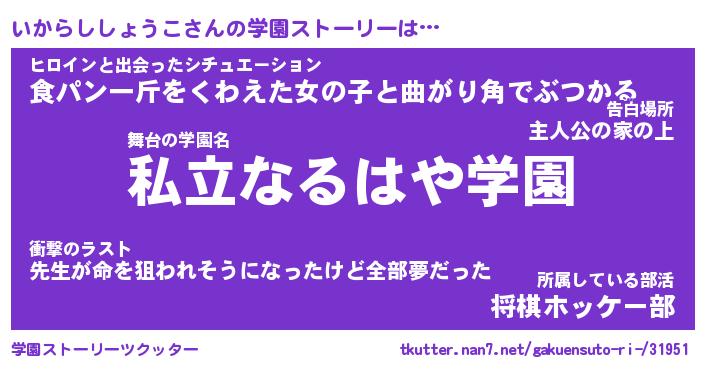 | 女子向けラノベタイトル風あだ名 | 『(仮)いからししょうこのやんごとなき事情』 |