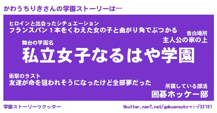 | 男性向けラノベタイトル風あだ名 | 『カワウチリキアートオンライン』 |