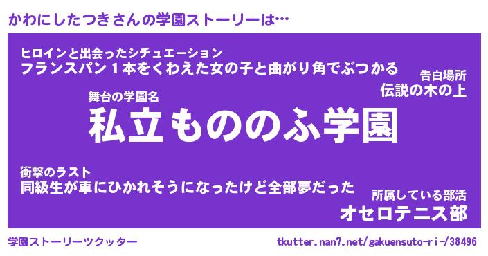 | 女子向けラノベタイトル風あだ名 | 『(仮)かわにしたつきのやんごとなき事情』 |