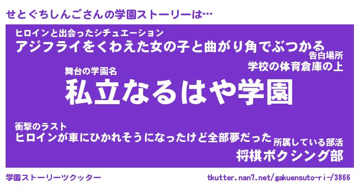 | 男性向けラノベタイトル風あだ名 | 『せとぐちしんごの憂鬱』 |