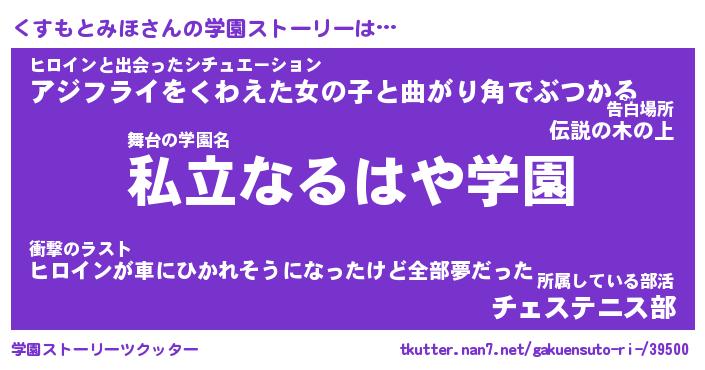 | 伝説のあだ名 | 『不死鳥のスナイパーくすもとみほ』 |