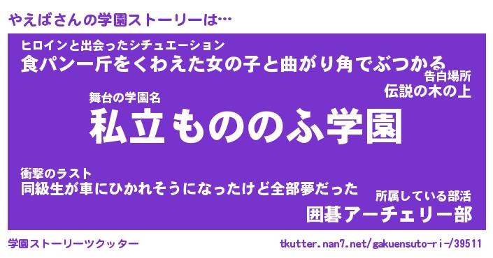 | 男性向けラノベタイトル風あだ名 | 『やえばの憂鬱』 |