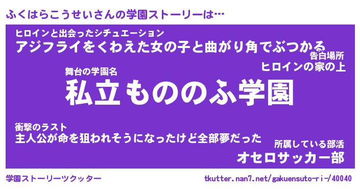 | 女子向けラノベタイトル風あだ名 | 『(仮)ふくはらこうせいのやんごとなき事情』 |