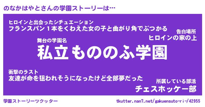 | 男性向けラノベタイトル風あだ名 | 『のなかはやとの憂鬱』 |