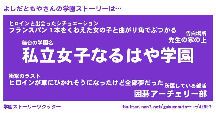 | 伝説のあだ名 | 『封印されしスナイパーよしだともや』 |