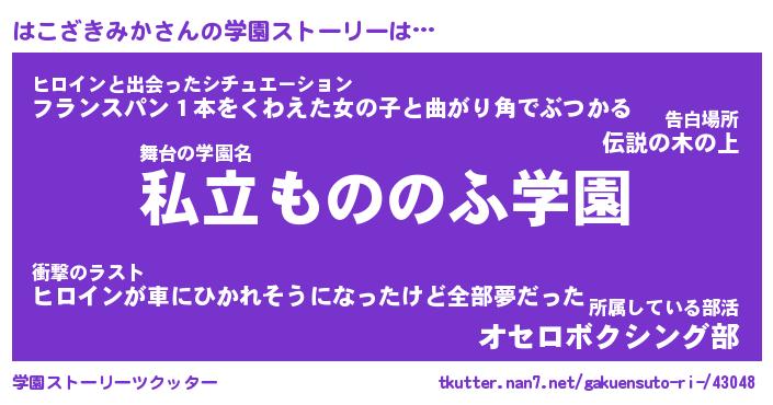 | 女子向けラノベタイトル風あだ名 | 『(仮)はこざきみかのやんごとなき事情』 |