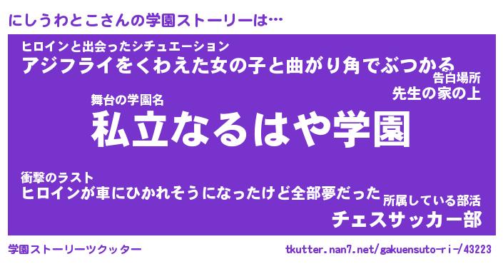 | ヒーロー風カッコイイあだ名 | 『スーパーニシウワトコ』『幻影騎士ニシ』 |