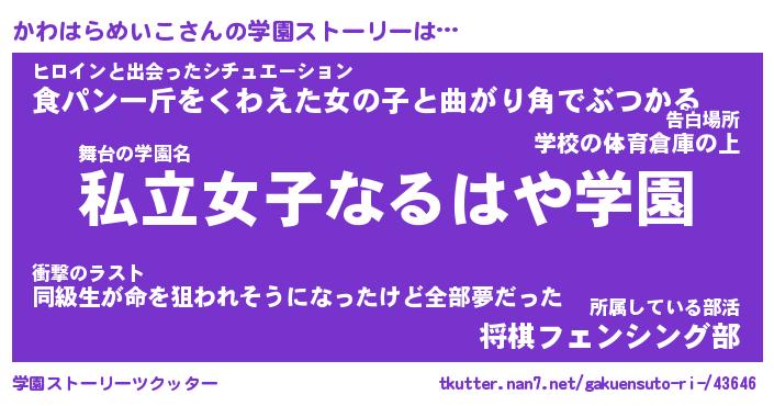 | 男性向けラノベタイトル風あだ名 | 『カワハラメイコアートオンライン』 |