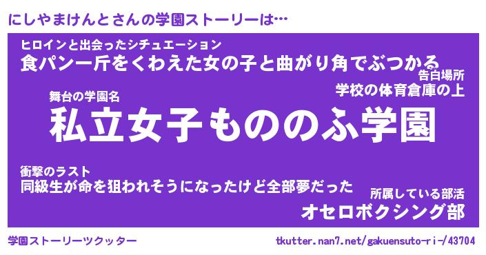 | 女子向けラノベタイトル風あだ名 | 『にしやまけんと姫と円卓の騎士』 |