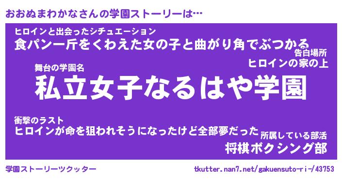 | 女子向けラノベタイトル風あだ名 | 『誰かこのおおぬまわかなを説明してください! ~契約から始まるウェディング~』 |