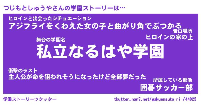 | 男性向けラノベタイトル風あだ名 | 『つじもとしゅうやの憂鬱』 |