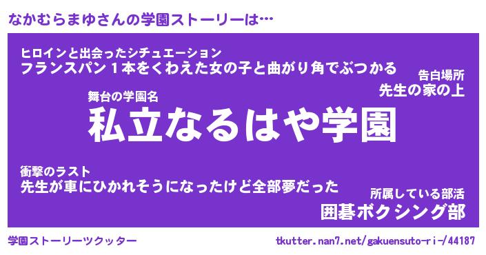 | 女子向けラノベタイトル風あだ名 | 『(仮)なかむらまゆのやんごとなき事情』 |