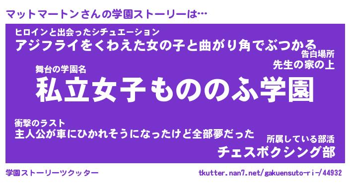 | 男性向けラノベタイトル風あだ名 | 『マットマートンアートオンライン』 |