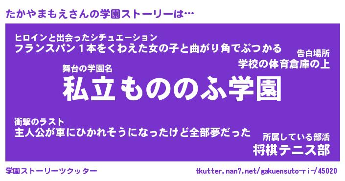 | 女子向けラノベタイトル風あだ名 | 『(仮)たかやまもえのやんごとなき事情』 |