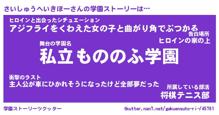 | 女子向けラノベタイトル風あだ名 | 『(仮)さいしゅうへいきほーのやんごとなき事情』 |